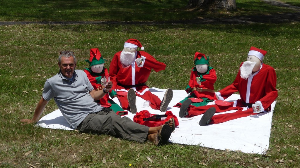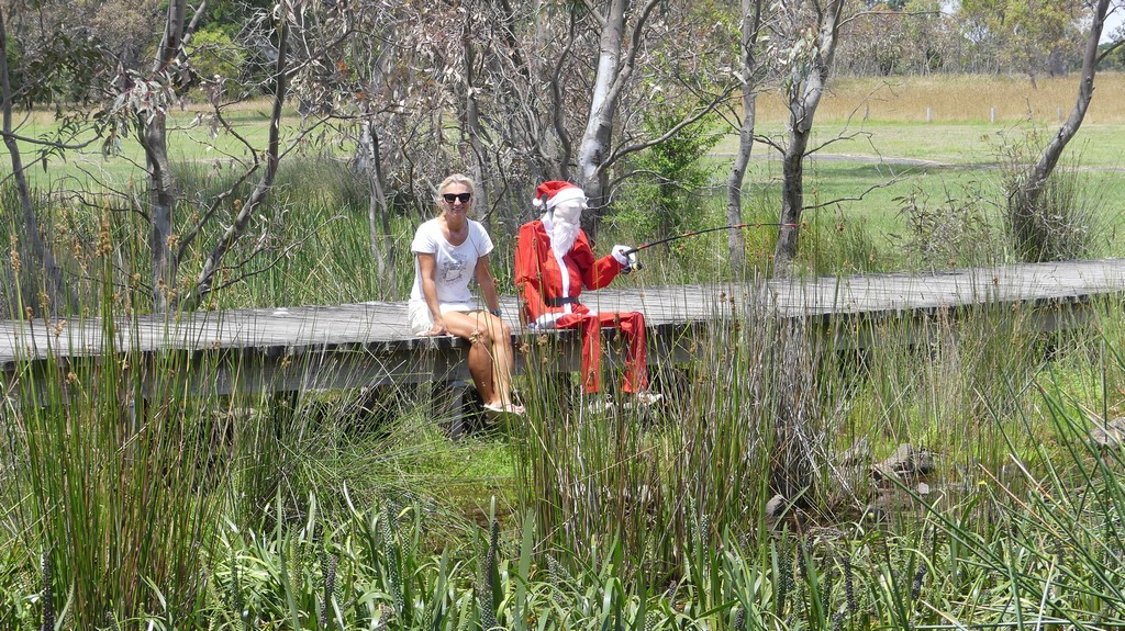 Hamilton Island is een resort-rijke klodder aarde, ergens midden de Whitsundays eilanden. Het heeft een vliegveld met landingsbaan vlak naast de jachthaven, vol grote joekels van jachten genre Puerto Banus. Sanuk lag er niet tussen, want kapitein Stef hangt graag de non-conformist uit en verkiest buitengaats aan een boei aan te leggen. Goedkoop, leuk, maar niet praktisch als je met 2 grote reistassen, elk een rugzak en met je propere kleren aan in een versleten bootje (de “dinghy”) de oversteek van het eiland naar de watercaravan genaamd Sanuk dient te maken. Maar zoals je kan zien op de prachtige selfie: zij waren blij ons terug te zien, en wij in tegengestelde richting ook.