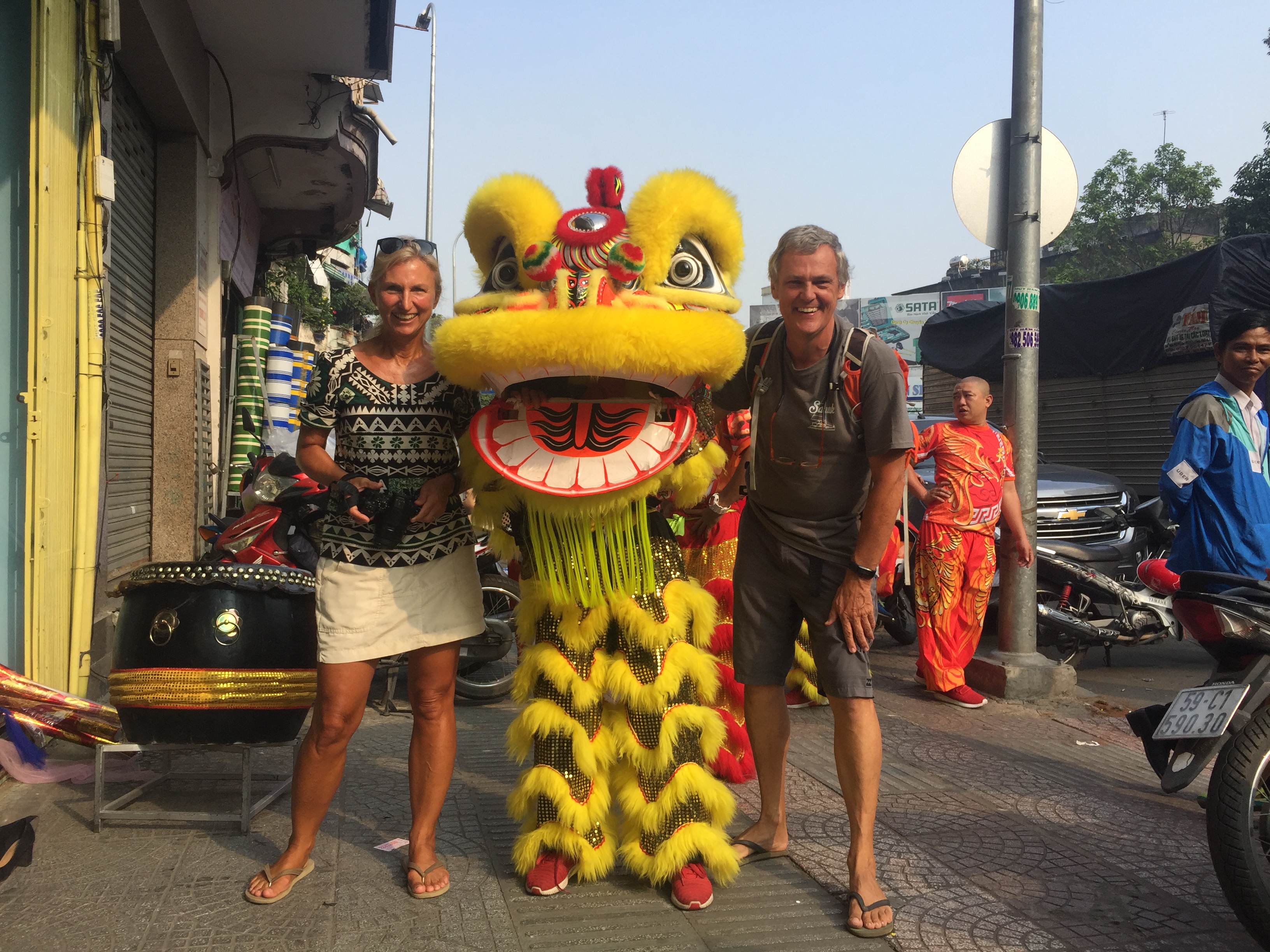 Tijdens onze vele wandelingen door de stad (we namen maar twee keer een Uber) kwamen we al de eerste tekenen van het komende nieuwjaar (16 februari) tegen. Hier komen twee tijgers de kindjes van de kleuterklas verassen. De vietnamezen vinden het heel leuk dat je als toerist geinteresseerd bent, je mag op de eerste rij staan. Dat moet je mij natuurlijk geen twee keer vertellen.