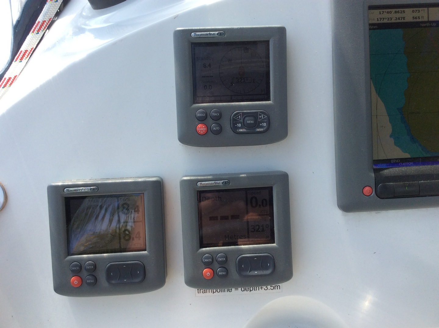 We hadden gehoord van een andere zeilboot dat hun navigatieprogramma tilt was geslagen bij het kruisen van 180°, en dat ze plotseling midden in het grootste eiland van Fiji, Viti Levu, aan het ‘varen’ waren. Ons nogthans bejaard Raymarine systeem (C120W van 2010) met kaarten van Navionics (V1.20, waarschijnlijk van rond 2014) was echter niet van slag te brengen. Wel heeft hij/zij(?) de onhebbelijke gewoonte om nu en dan eens zijn gps signaal te verliezen, waardoor we een minuut of twee niet meer weten waar we zijn op de wereld. Gelukkig houdt de autopiloot dan de laatste koers aan, zodat we niet plotseling van een ruime wind tot scherp aan de wind draaien. Of bij dagenlang continu gebruik zoals een oversteek durft het navigatieprogramma al eens te herstarten, meestal terug zonder veel erg en het houdt ons alert. Bij het schrijven valt me op dat we onze autopiloot, toch wel de belangrijkste derde man aan boord, nog geen naam gegeven hebben. Daarom vanaf nu, standvastige Stanny als piloot en Ray voor het navigatiesysteem.