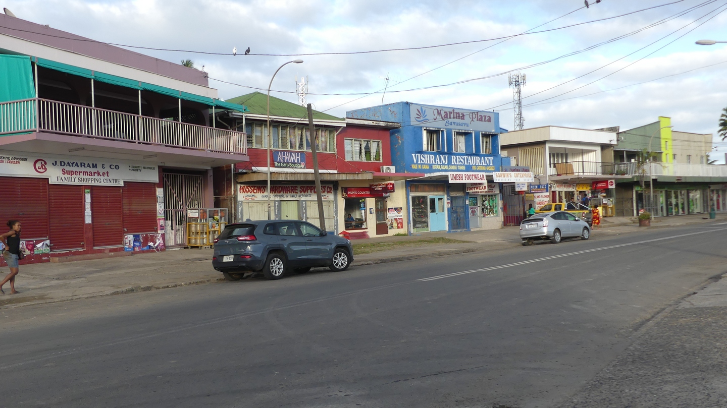 The main street in Savusavu with all the businesses and restaurants. Most of these are owned by Indians who have clearly more commercial ambitions than the Fijians. This picture was taken on a sunday morning, no stores open or people on the street.