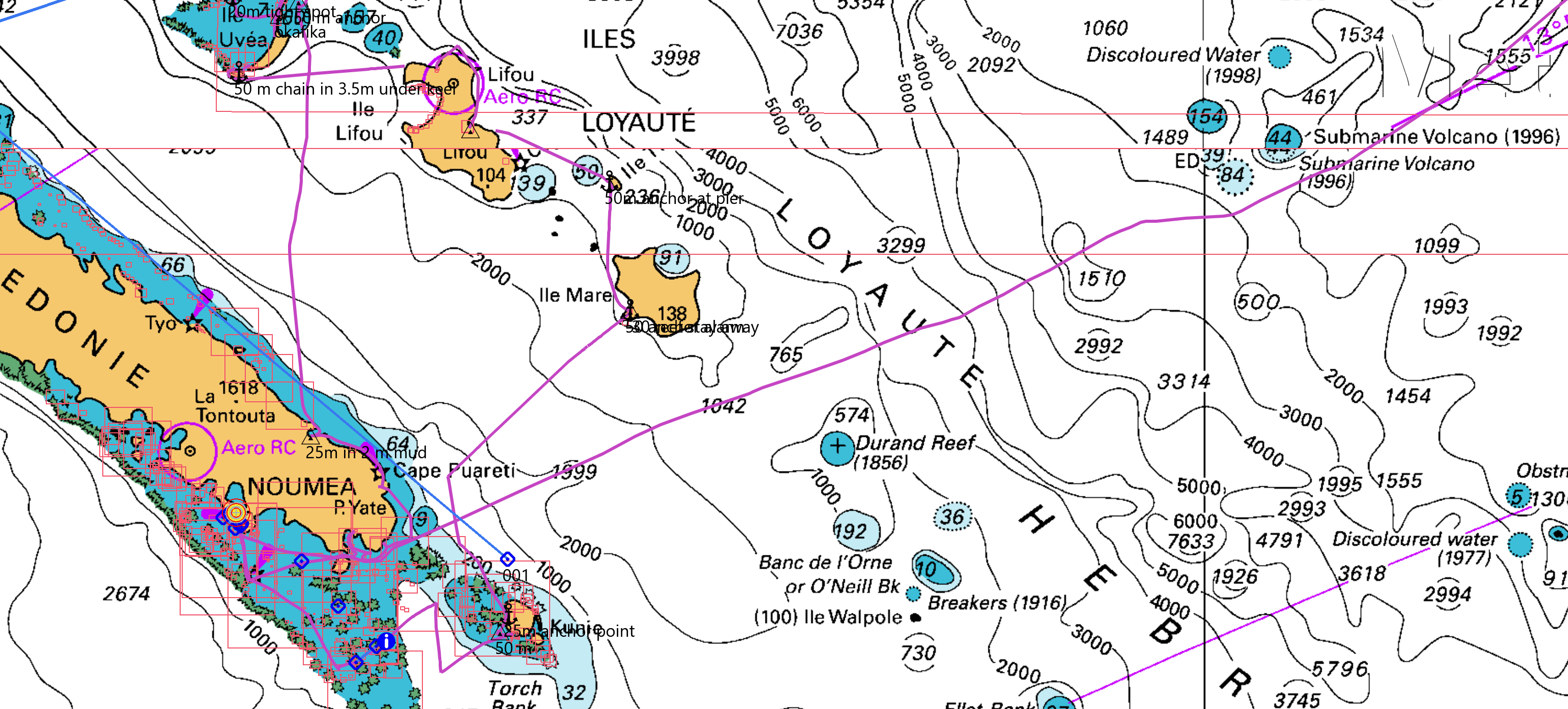 De paarse lijn op de kaart hierboven is hoe we gevaren hebben. Rechts (niet op de kaart is Fiji). We vermijden mooi alle kruisjes op de kaart: rotsen, al dan niet onder water op een diepte van minder dan 10 meter. Zo zie je dat Durand Reef gerapporteerd is in 1886 en eigenlijk een onderwater berg is want rondom is de zee 574m diep.
