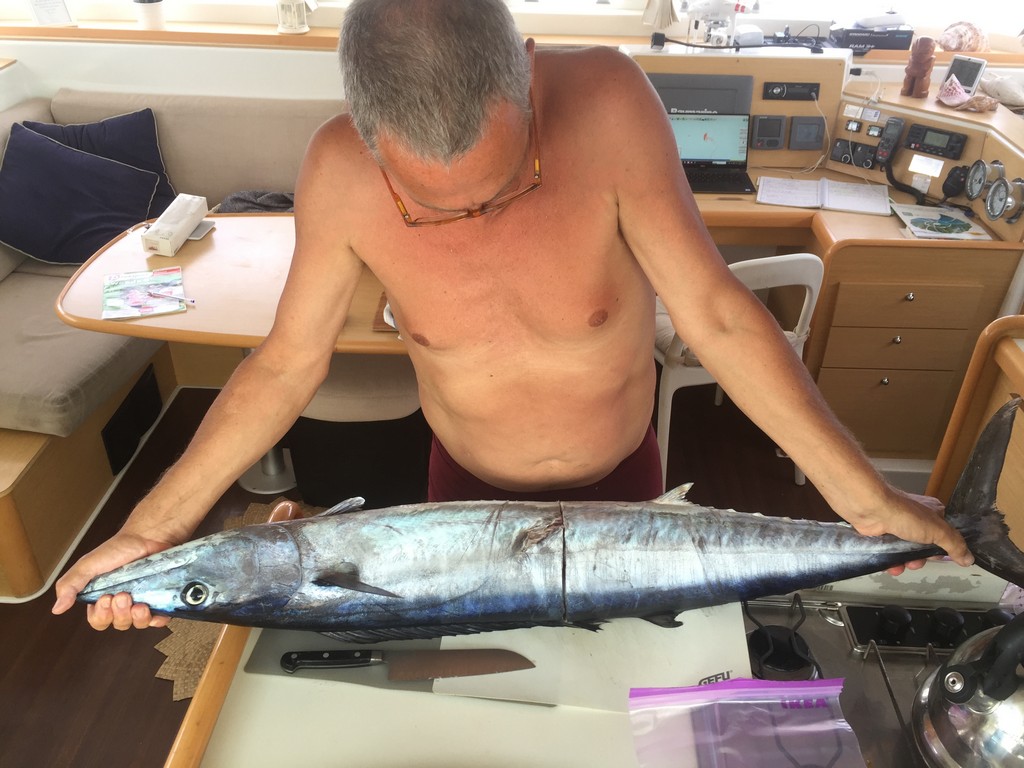Onderweg van Mare naar Lifou. Een mooie yellowfin tuna aan de haak. We hebben ervan gesmuld!