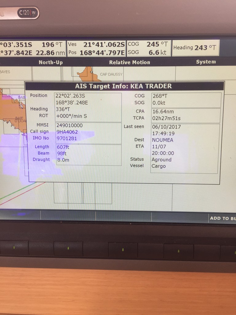 Net voor we toekwamen in Nieuw Caledonia passeerden we op ongeveer 5 mijl voorbij Durand reef, en daar lag blijkbaar een schip: