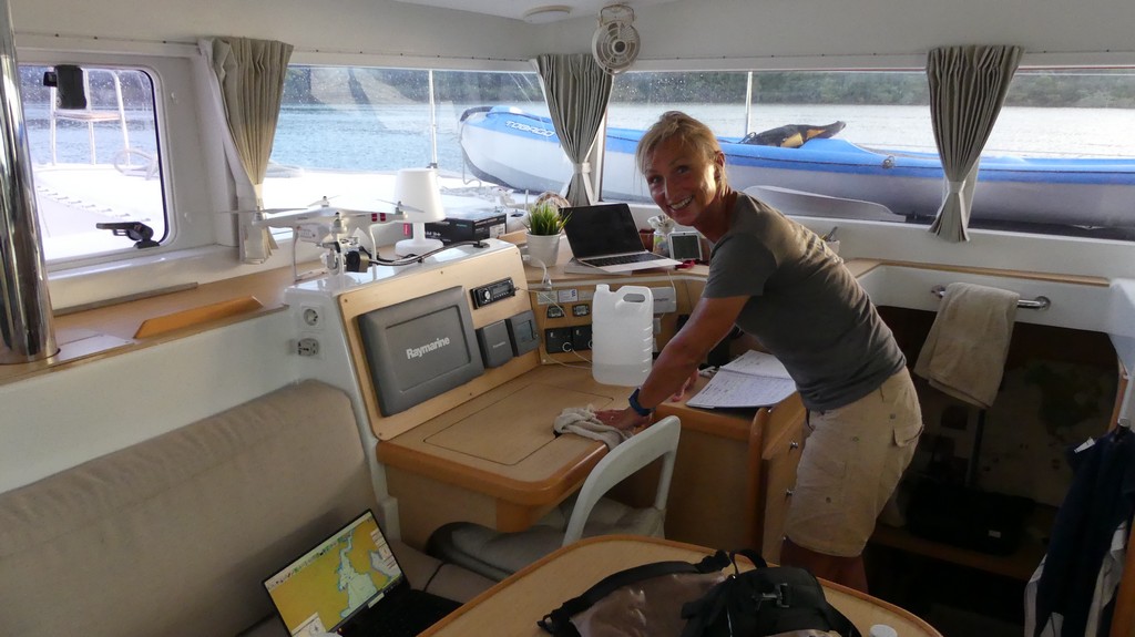 Nu moeten we zeggen dat we binnen ook een C120W hebben (Bisray), maar we die meestal niet gebruiken. In plaats daarvan draaien we een programma op de pc, OpenCPN, dat ik eigenlijk beter vind. We kunnen er immers satellietfoto’s van Google Earth mee opladen, en die geografisch laten overeenkomen met de getekende kaarten. Dus kunnen we op moeilijke plaatsen, zoals bij een pas of een rif, heen en weer flippen tussen de satteliet foto en de kaart. De pc heeft een gps-puck, zodat we twee onafhankelijke systemen van navigatie hebben. Ook hebben we een ipad met een bluetooth GPS en daarop een Garmin kaartprogramma. We zorgen voor redundantie, door ook nog twee Iphones met gps te hebben, en een Garmin gps handtoestel dat in de ‘grab bag’ zit. Dus zolang het gps systeem niet uitvalt zullen we weten waar we ons op aarde bevinden! (oh, ik vergat de sextant) Terzijde, de grab bag is de sportzak die we meenemen in het reddingsvlot en altijd klaar staat. Daarin zit ondermeer een manuele watermaker, vuurpijlen, ehbo kist, energie repen, batterijen, vhf, mes, zaklamp, spiegeltje, zonnecreme, visgerief.