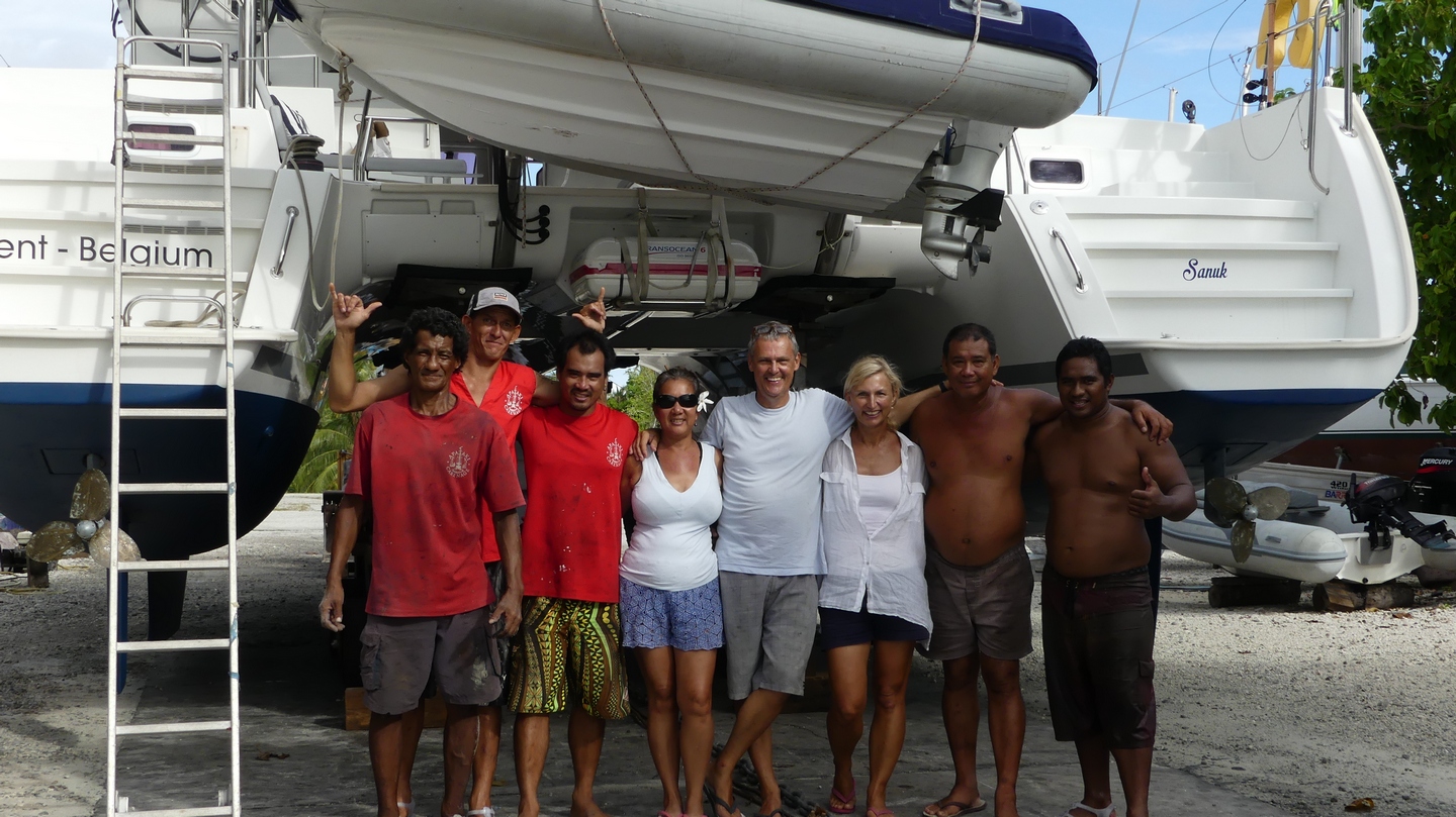 Maar om 02:00 uur kwamen we aan in de haven van Apataki dorp, en daar stonden enkele van de eigenaars van Apataki Carenage, de familie Lau, ons op te wachten. Samen met onze 150kg bagage zijn we naar het verblijf van de Lau’s in Apataki dorp getrokken, en de volgende dag met de boot naar de Apataki Carenage zelf, waar Sanuk op het droge ligt.